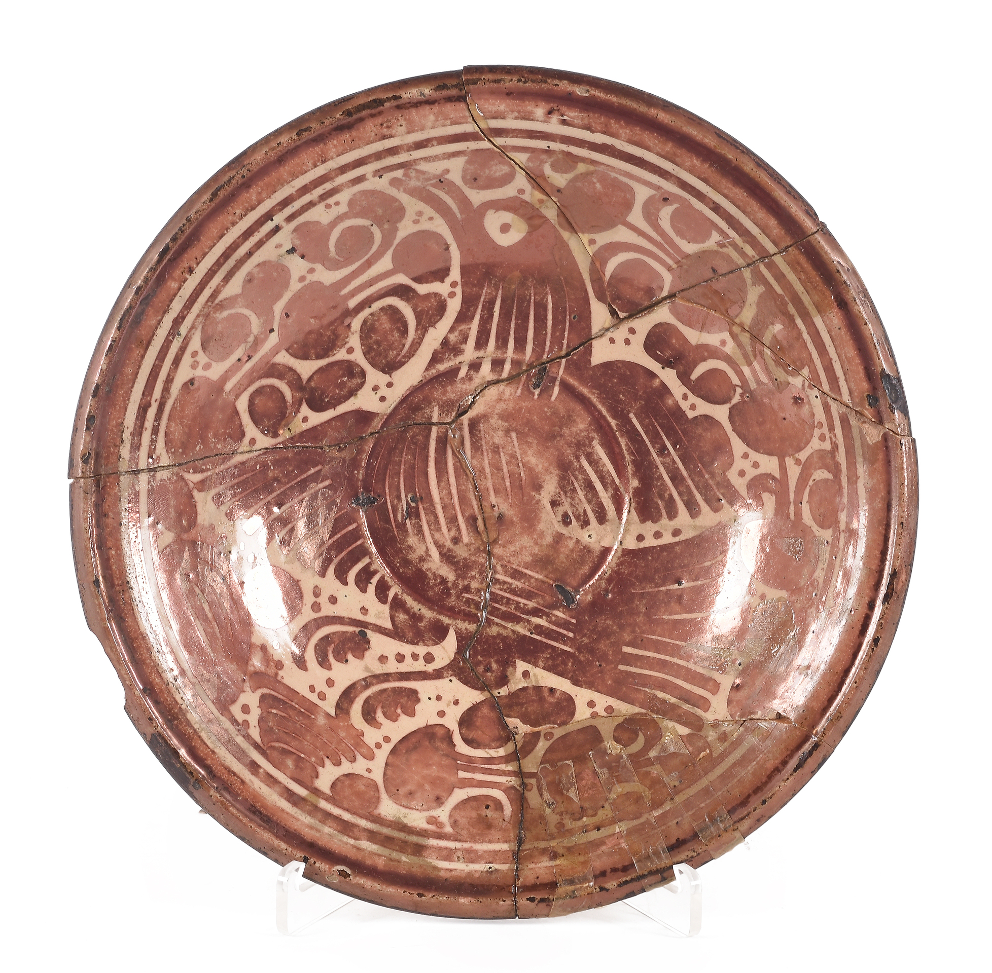 Plato realizado en cerámica de reflejo representando ave. Manises, Valencia. Antiguas restauraciones.