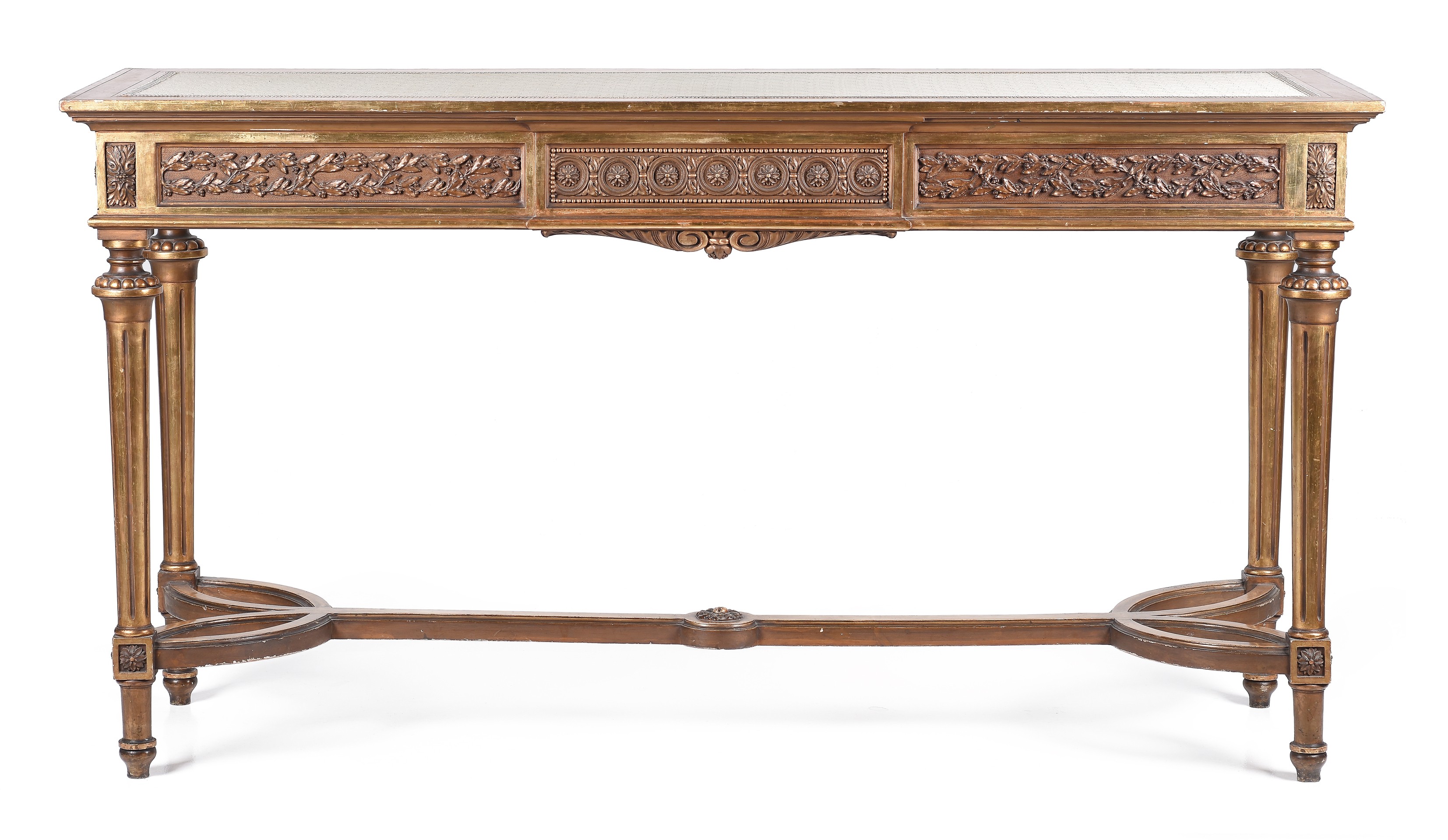 Consola realizada en madera dorada con encimera tapizada.