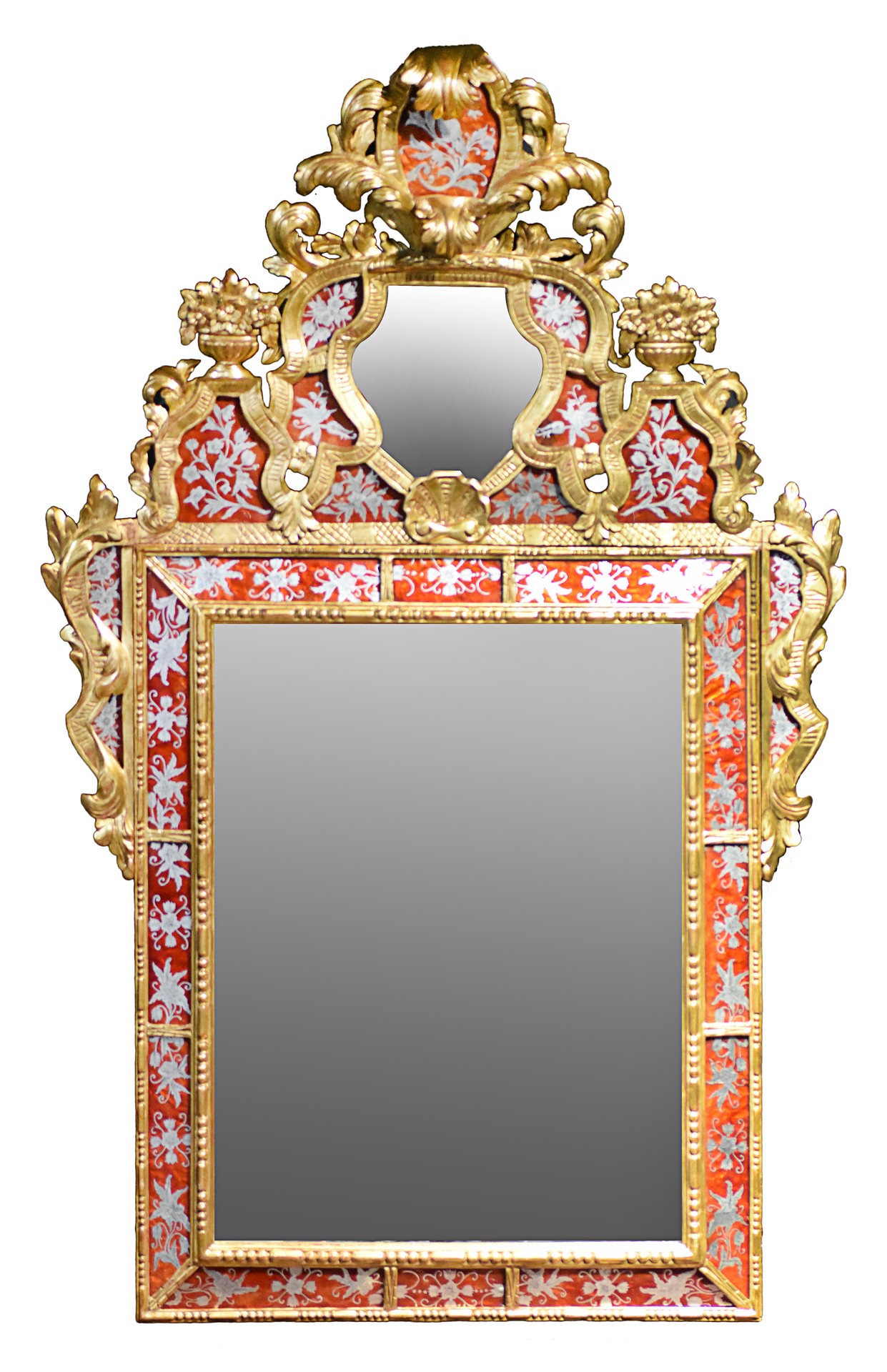Importante espejo realizado en madera tallada y dorada con decoración de cristales pintados. Siguiendo modelos venecianos del Siglo XVIII.