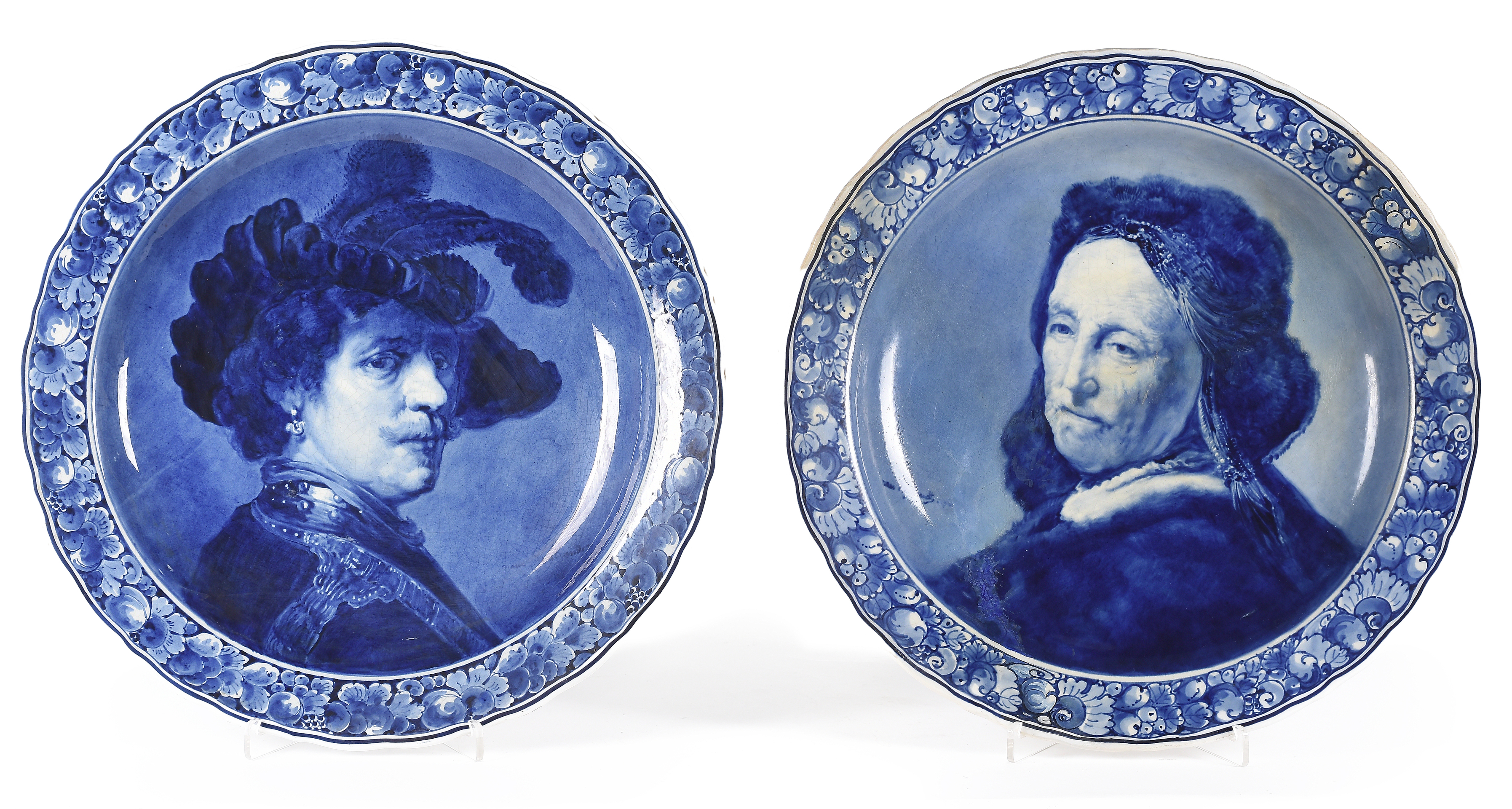 Pareja de platos realizados en cerámica Royal Delft representando a Rembrant y otro personaje.