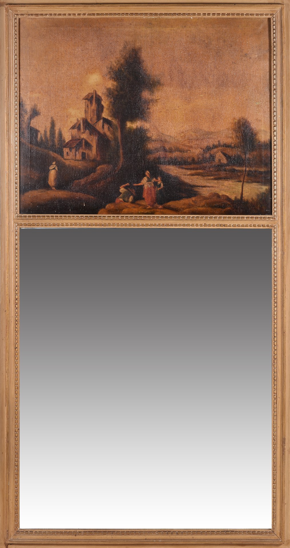 Trumeau realizado en madera dorada con pintura al óleo representando escena rural.