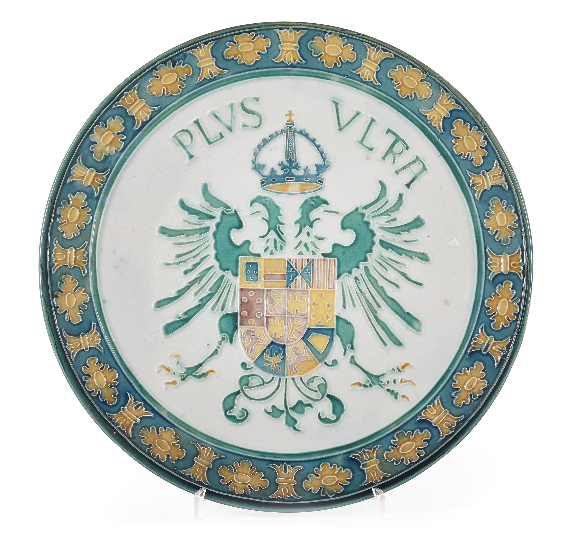 Plato realizado en cerámica esmaltada representado el escudo de Carlos V y el lema "Plus Ultra" .