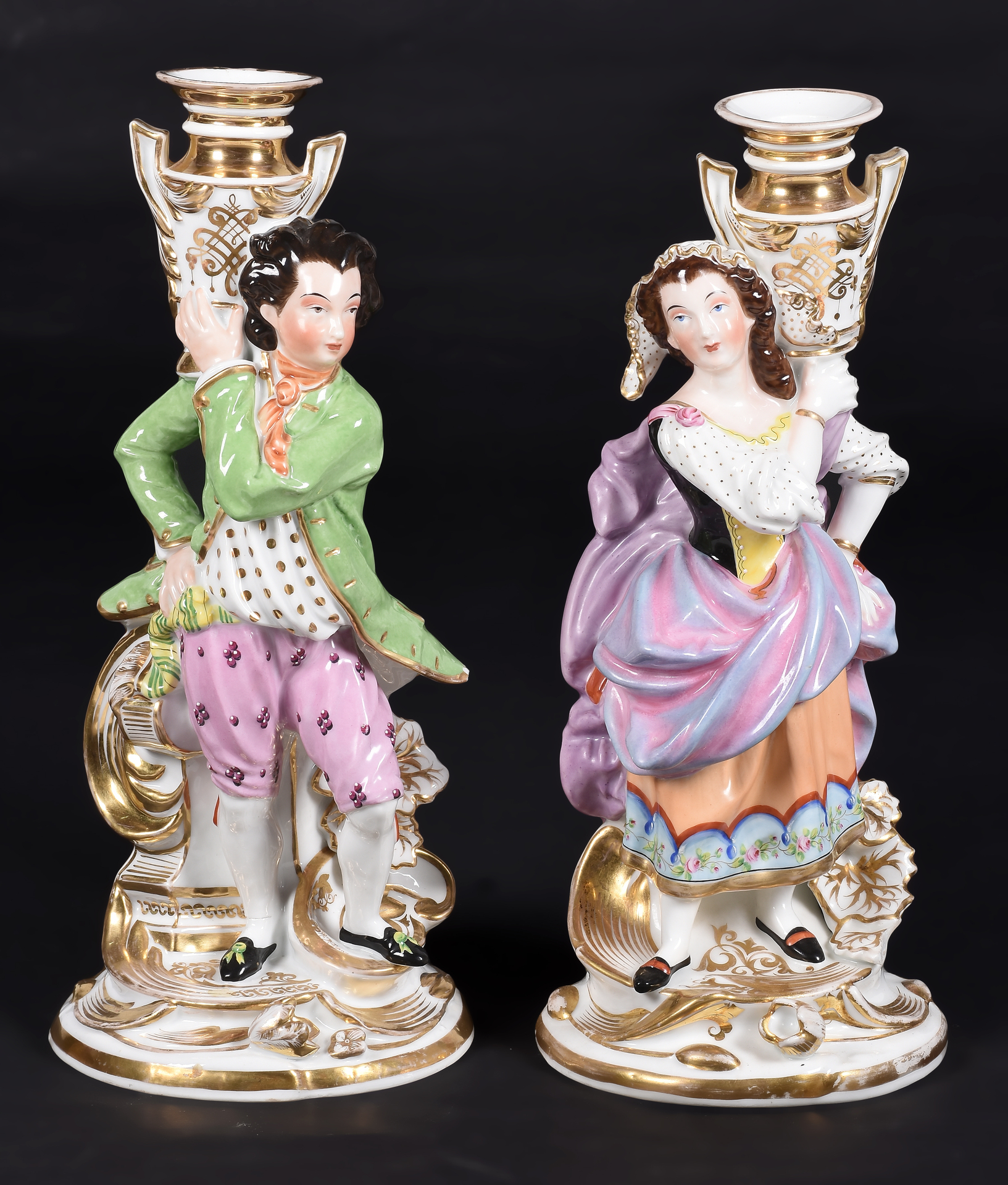 Pareja de candeleros realizados en porcelana representando "Dama y caballero". Con faltas.