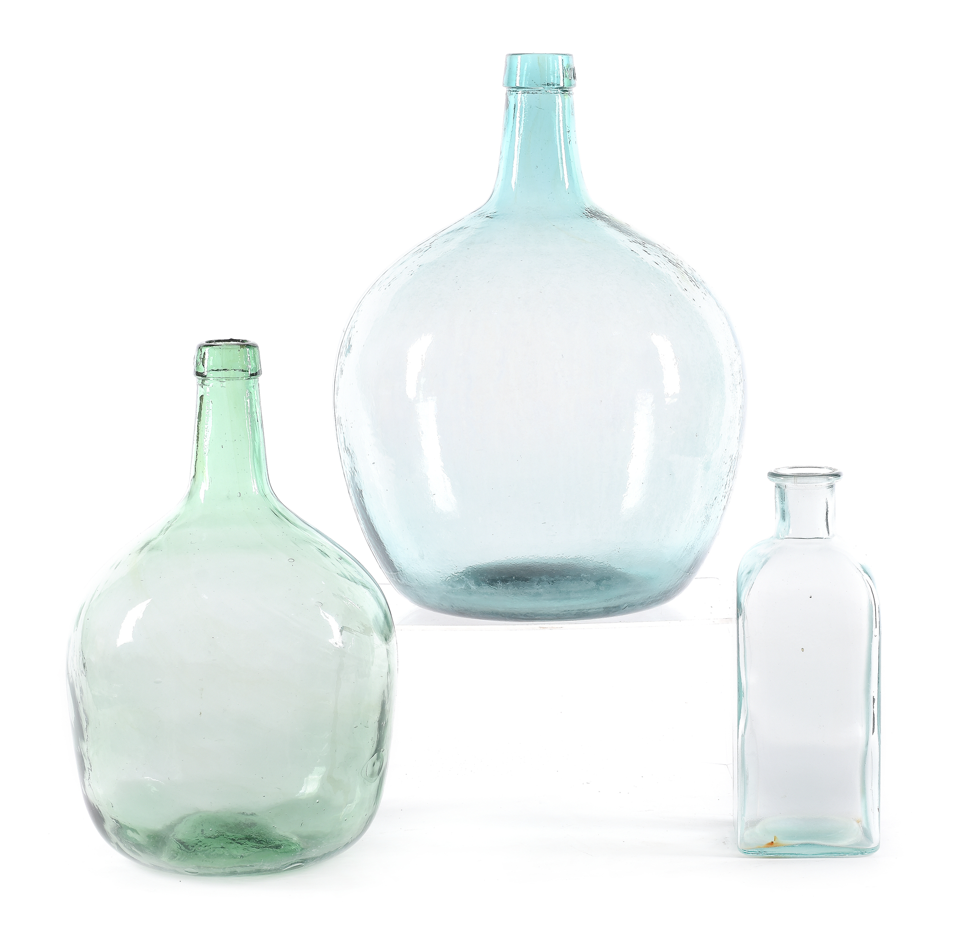 Lote compuesto por una botella y dos damajuanas realizadas en cristal.