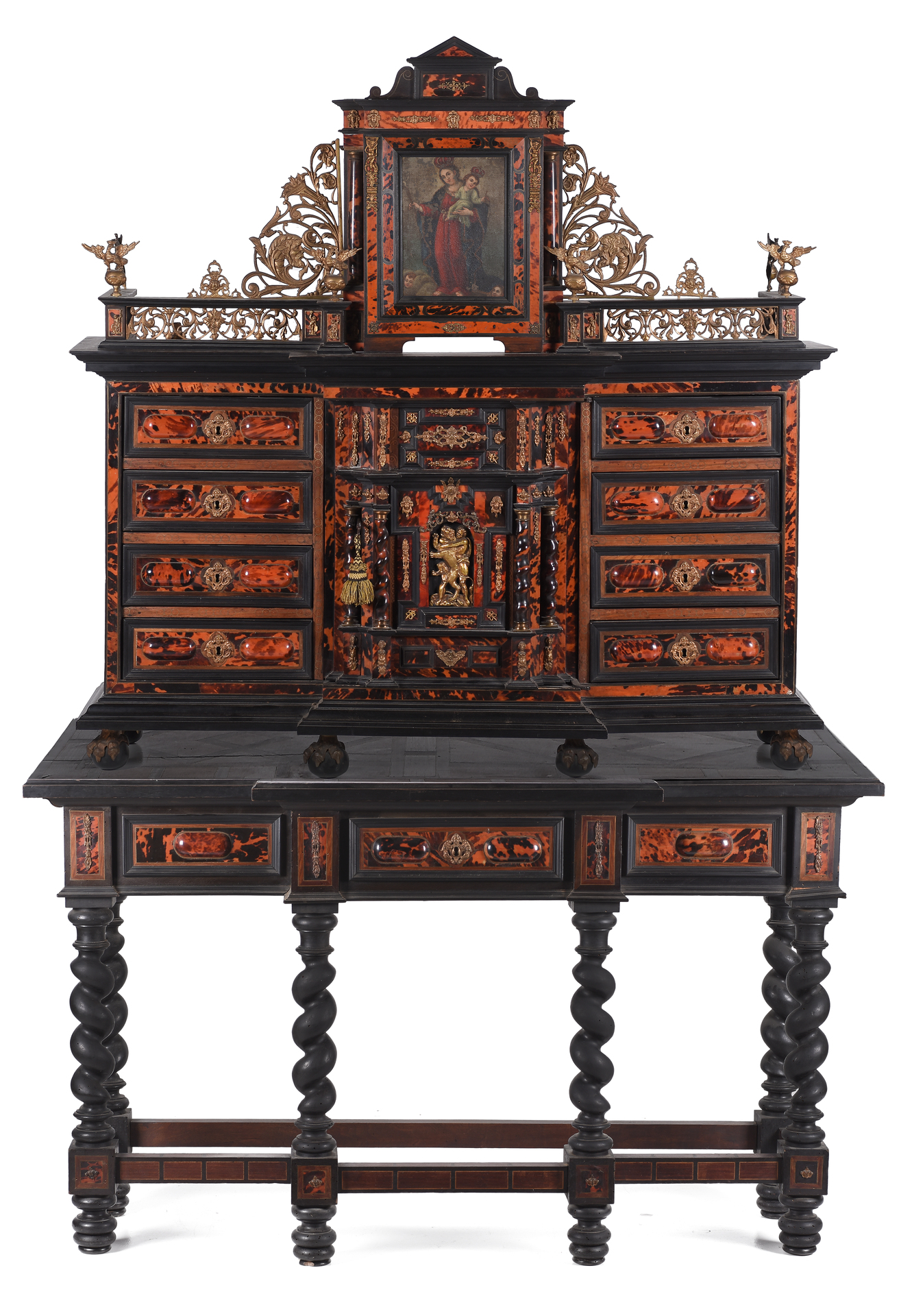 Importante bargueño flamenco realizado en madera con marquetería de nácar y decorada con un cobre pintado representando a la Virgen del Rosario con el Niño.