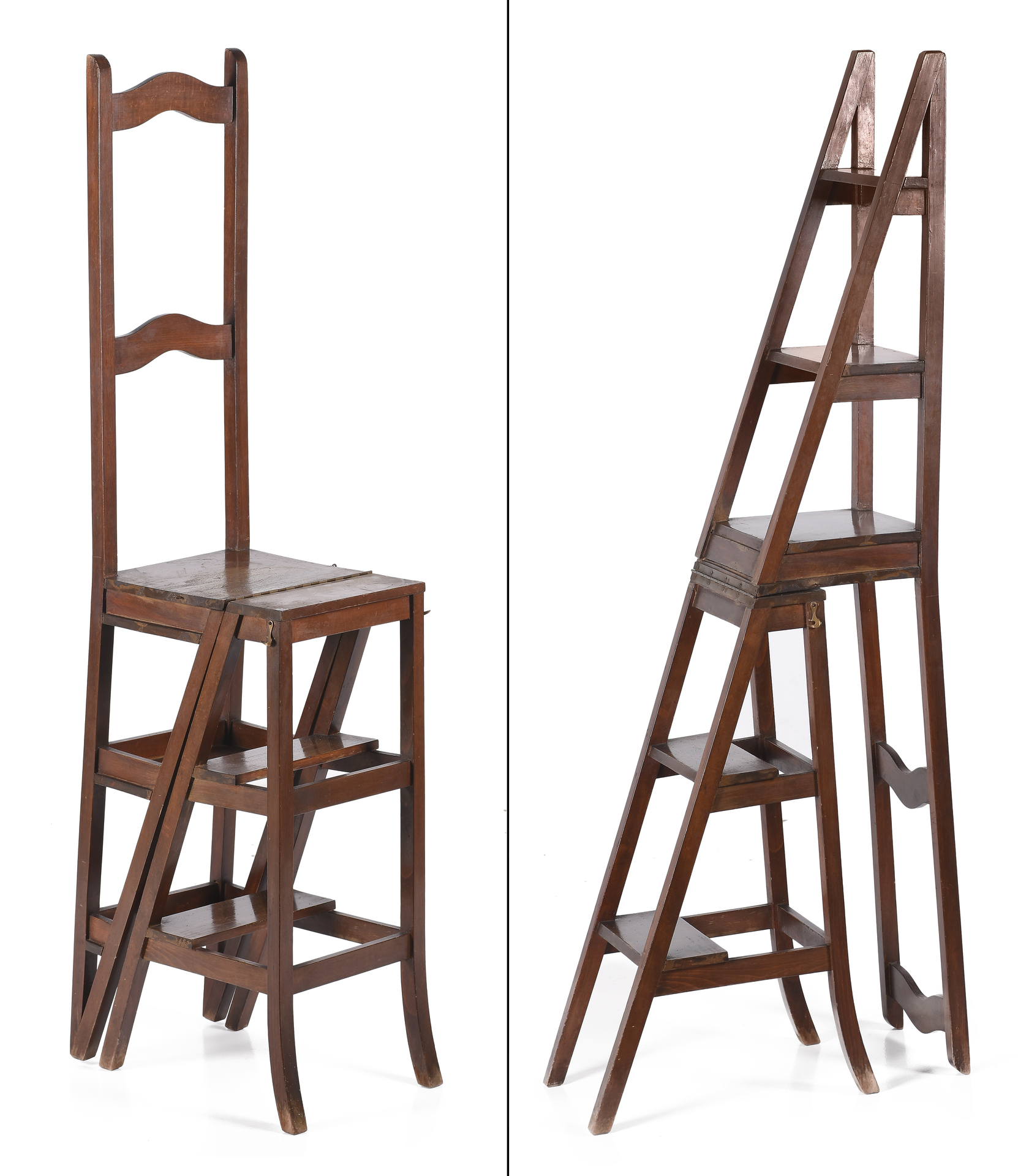 Escalera transformable en silla de biblioteca realizada en madera.