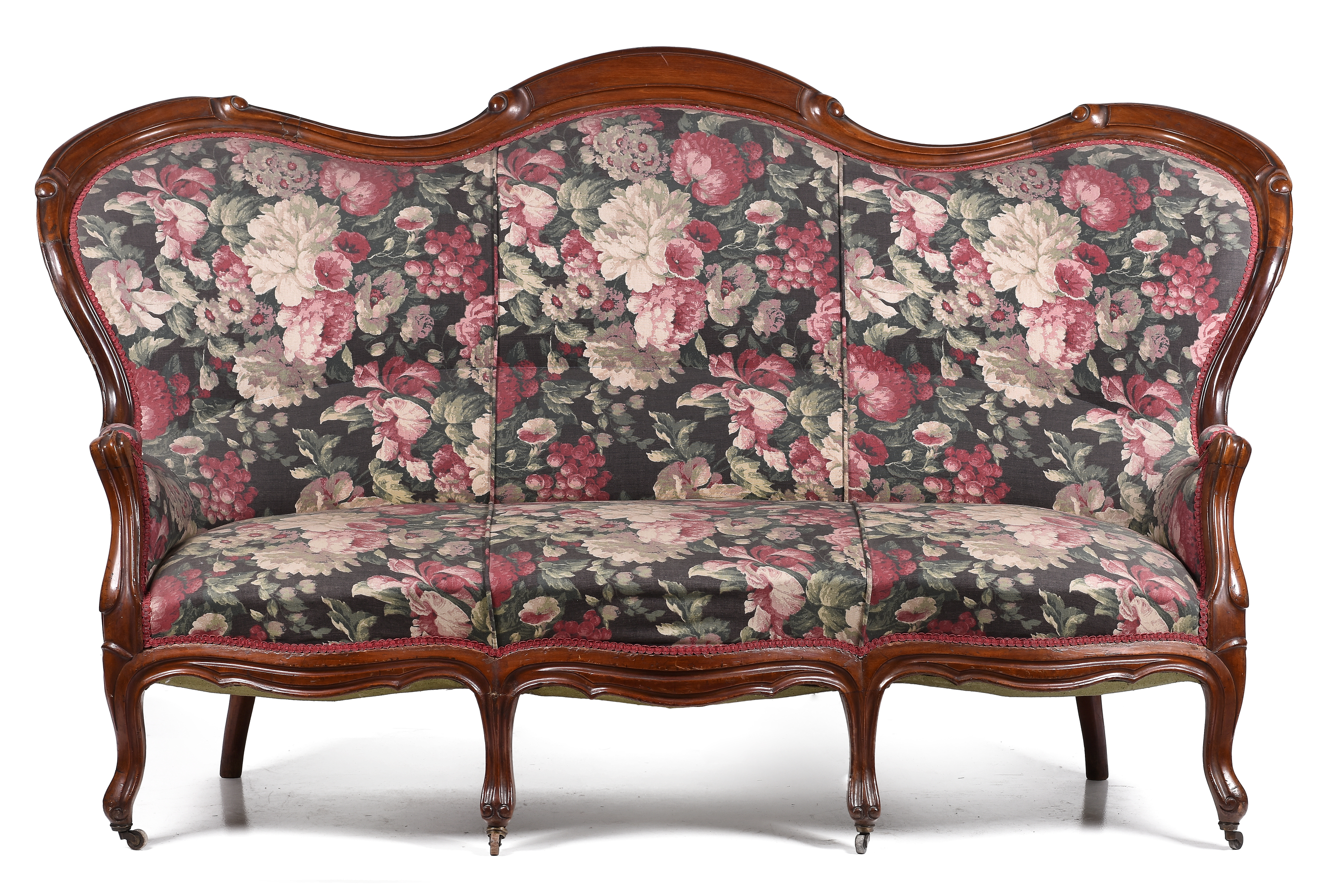 Sofá realizado en madera de caoba y tapizado floral. Estilo Louis XV.